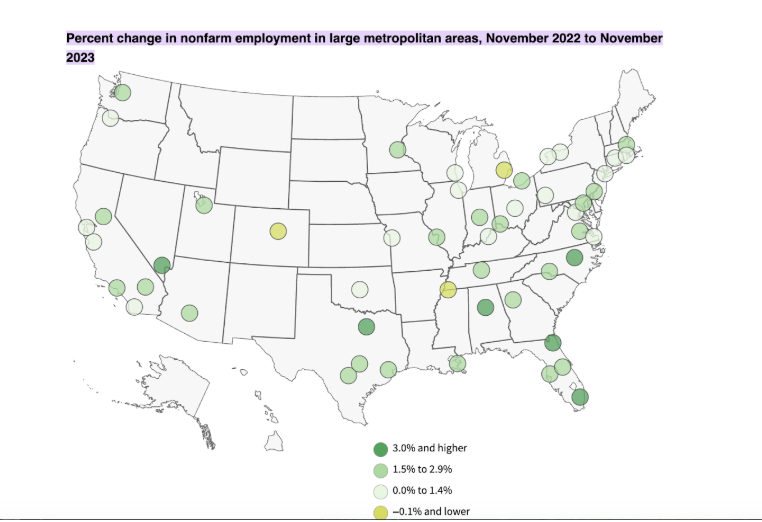 Labor market trends reinforce the same pattern. According to the U.S. Bureau of Labor Statistics, Dallas–Fort Worth recorded the largest net employment increase between November 2022 and November 2023, adding nearly 140,000 jobs. New York and Los Angeles followed, each adding over 100,000 jobs over the same period.